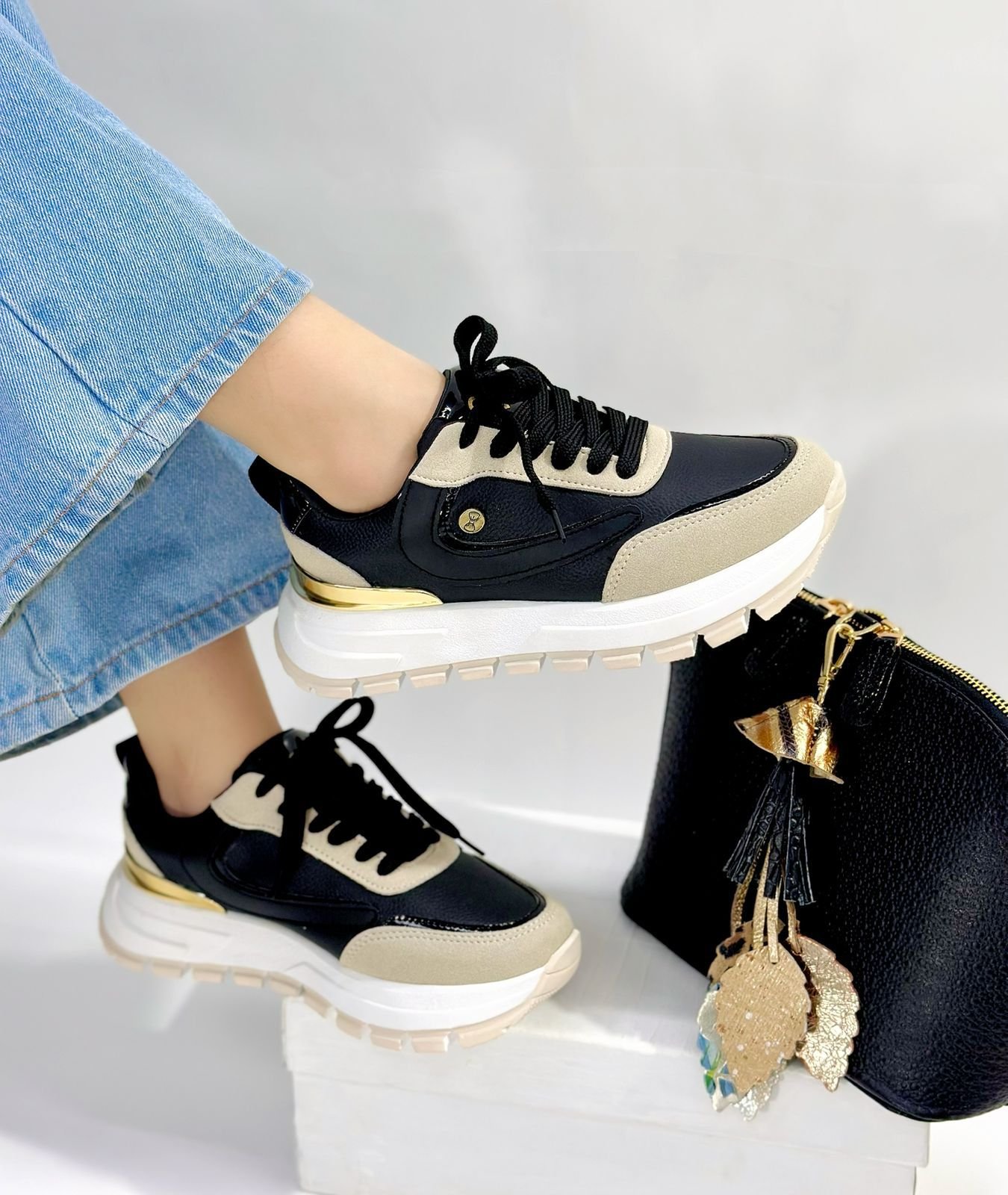 Su combinación de negro y color lecherita crea un contraste elegante, mientras que el detalle dorado en la parte trasera aporta un toque de distinción. La plataforma con borde blanco completa el diseño, ofreciendo un acabado moderno y muy estilizado.
