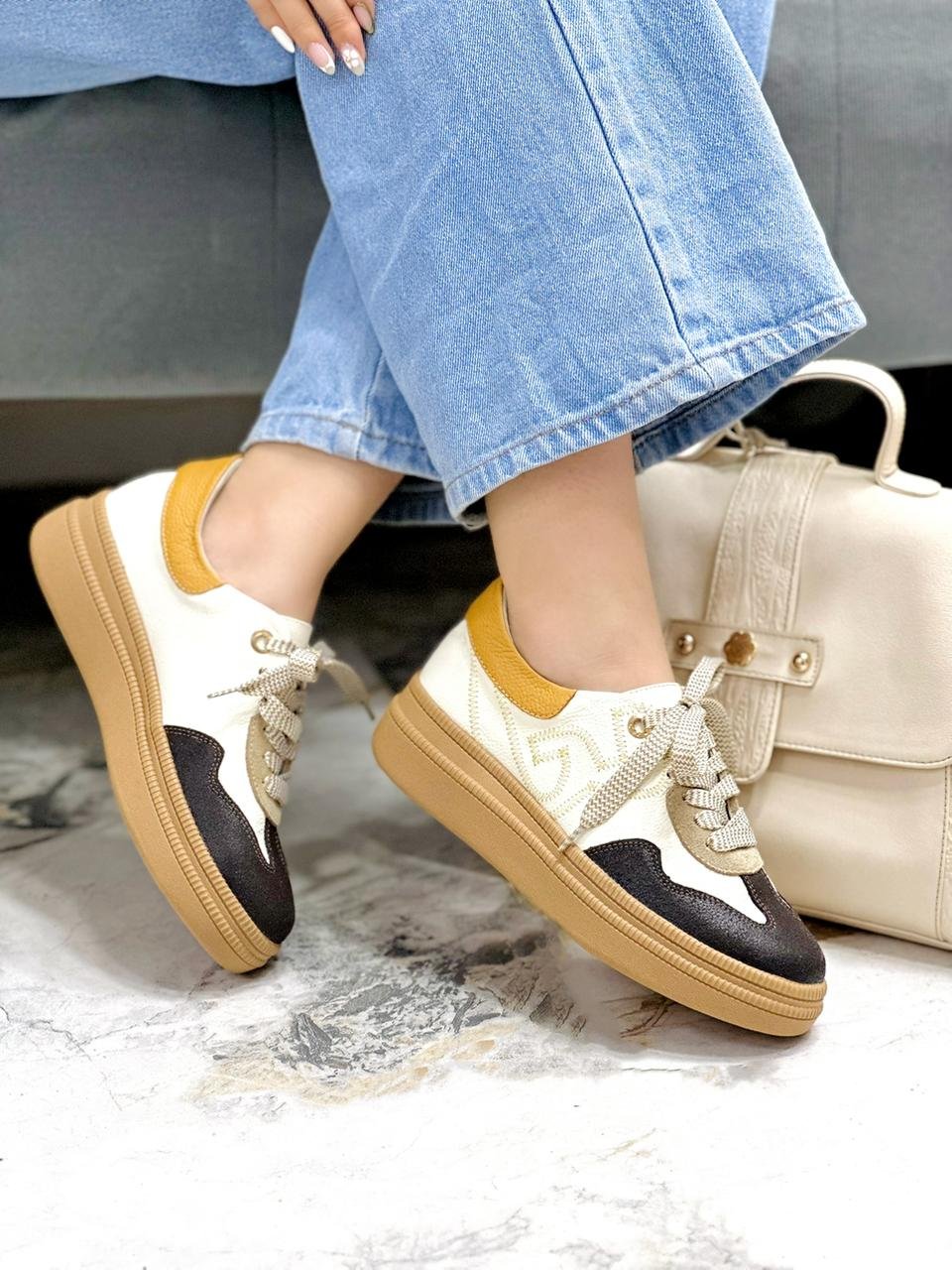 Luce impecable cada día con los tenis  en cuero, el equilibrio ideal entre elegancia y comodidad. Con detalles en cuero color Negro en la parte frontal y en color mostaza en la parte trasera elevan tu oufit. Diseñados pensando en tu estilo de vida dinámico, estos tenis combinan la versatilidad con la elegancia.