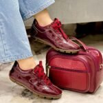 Su intenso color vino tinto aporta un brillo sutil que realza su diseño y los hace destacar en cualquier outfit. Los cordones en tono rojo crean un contraste perfecto, mientras que la suela café complementa el look con un acabado cálido y sofisticado.