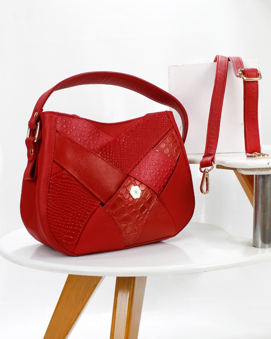 Bolso en Cuero de Avestruz Dorado y Rojo Versátil – NC-B023